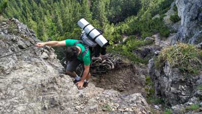 wspinaczki taterniczej, co utrudniają dodatkowo plecaki zapakowane na parę dni włóczęgi oraz silny wiatr. Tym razem nie pomogą nam łańcuchy czy stalowe liny jak na